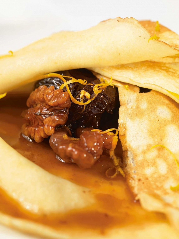 Пшеничные блинчики с соусом из чернослива, грецких орехов и апельсинового сока