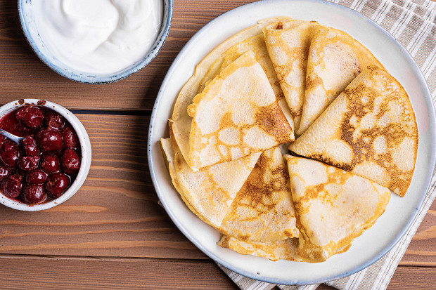 Базовый, но тем и привлекательный рецепт, где воздушные блины на молоке встречаются со своими давними спутниками — сметаной и вареньем. Если сложные рецепты приедаются, то этот — никогда. Чтобы разнообразить меню в течение всей недели Масленицы, достаточно ставить на стол каждый день новое варенье: сегодня — клубничное, завтра — грушевое, а послезавтра — манго-маракуйя.