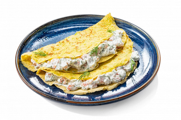 Тертый кабачок придает тесту ту воздушность и легкость, которую от блинов ожидать сложно, но очень хочется. К тому же это отличный способ накормить детей полезными, но не всегда любимыми овощами. Давно проверено, что кабачок здорово ладит со слабосоленым лососем и творогом, нежность кабачковых блинов отлично вписывается в этот союз. Важный момент — тертый кабачок обязательно нужно отжать, чтобы блины не расползлись на сковороде и цепко держали начинку.