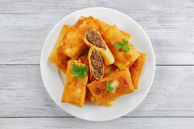- На половинку каждого блина выложите 2 столовые ложки паштета и сверните блины в трубочку, подгибая края.