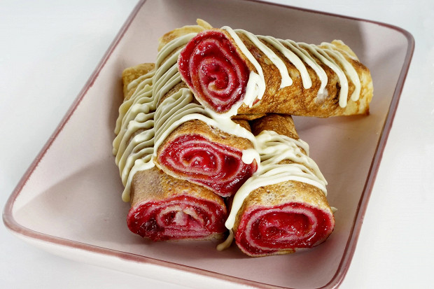 - Блины смажьте белым шоколадом, потом вишневым вареньем и заверните рулетиком.