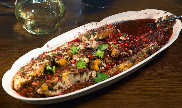 Простейшее блюдо и при этом одно из самых нарядных и богатых на вид в нашей подборке. Осетрина в нем отварная, главную вкусообразующую роль играет соус — из кинзы с чесноком, солью и гранатовым соком.