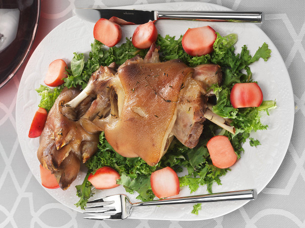 Это блюдо начинается с маринада с ароматными травами — в нем рекомендуется держать голяшки в течение суток, а то и двух. Затем голяшки запекают в бульоне, на это готовьтесь потратить еще 3–4 часа. А дальше самое интересное. Все это лучше проделать за несколько дней до праздника. Потому что непосредственно перед подачей голяшки придется еще раз запечь — на этот раз без бульона — до корочки. Это нужно для того, чтобы, во-первых, разогреть мясо, во-вторых, придать ему нарядный вид.