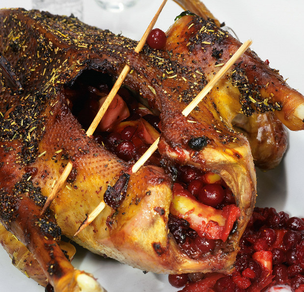 Подготовительная работа потребуется хорошая. Сначала гуся варят в пряном овощном бульоне, затем маринуют в семи других специях. Наконец за два часа до подачи его фаршируют смесью клюквы и яблок и запекают.