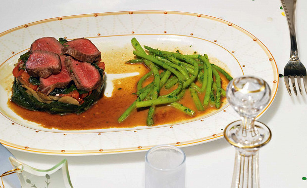 Главное в этом блюде — соус. Все остальное очень просто, а вот над соусом придется потрудиться. Сначала бараньи кости запекают в духовке вместе с овощами, затем заливают коньяком, водой и варят, а получившийся бульон уваривают в густой ароматный соус.