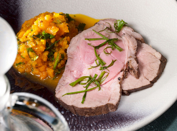 Свинина в луковой шелухе с морковным пюре и луковым джемом