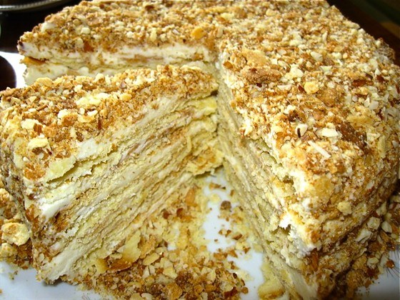 Корни рецепта любимого торта уходят в те времена, когда русская дворянская кухня в своих пристрастиях ориентировалась на французский опыт. Его предтеча — многоярусный французский мильфей, торт из тысячи слоев тонкого теста. По версии, которую приводит, в частности, Вильям Похлебкин, под псевдонимом «Наполеон» этот парадный десерт появился в Зимнем дворце в 1912 году, на приеме в честь столетнего юбилея изгнания французской армии из России. В тот день было сервировано немало блюд, названных именами тех или иных персонажей кампании 1812 года, но в историю вошел только многослойный торт треугольной формы, напоминавший треуголку полководца. Правда, со временем коржи стали выпекать в форме прямоугольника просто ради удобства. Но подлинным королем праздничных тортов «Наполеон» стал в советское время, поскольку требовал не столько дорогих или редких продуктов, сколько сноровки в приготовлении.
