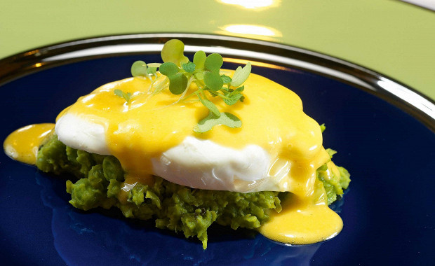 Сливочное пюре из зеленого горошка и яйцо пашот заливают домашним шафрановым майонезом, отчего конструкция приобретает младенческую нежность.
