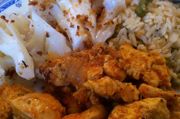 Куриные грудки готовятся быстро, но сами по себе выглядят скучно. Однако стоит добавить щепотку карри — как картинка меняется. Карри отлично подходит и к цветной капусте, которую тоже долго ждать не придется. Капусту можно использовать замороженную, а если в морозилке есть овощная смесь — использовать и ее. Еще удобно, что и грудки, и капуста готовятся на одной сковороде. Только не передержите капусту — она должна остаться хрустящей.