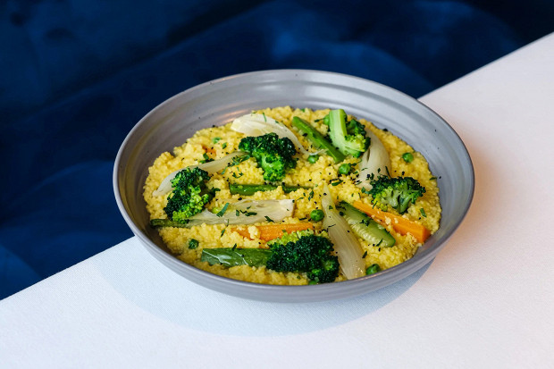 Питательное вегетарианское блюдо, собранное по всем правилам ПП. И, что приятно, очень быстрое. В отличие от прочих круп, кускус не нуждается в варке, в этом рецепте его приводят в кондицию с помощью овощного бульона, подкрашенного шафраном. Рецепт из ресторана «Магадан» может и сам по себе стать достойным ужином, и выступить в качестве гарнира к любым морепродуктам — креветкам, кальмарам и т.д. Тем более что и они готовятся за пару минут и при этом снабжают ужин необходимой дозой белка.