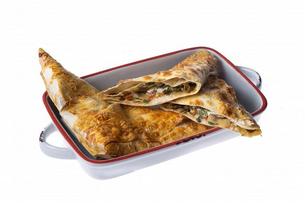 Тонкий лаваш в быстрых блюдах может стать адекватной заменой тесту. Сочетание в начинке жареных грибов, сладких помидоров и соленого сыра — яркое и абсолютно беспроигрышное. Сложить такие конвертики для всех членов семьи много времени не займет, а духовка превратит их в румяные подобия чебуреков без всякого вашего участия. Единственное, что может смутить, — всем домашним придется дышать друг на друга чесноком. Без него, конечно, можно обойтись, но без чеснока, как и без щепотки грузинских приправ, впечатление от этих конвертиков будет более блеклым.