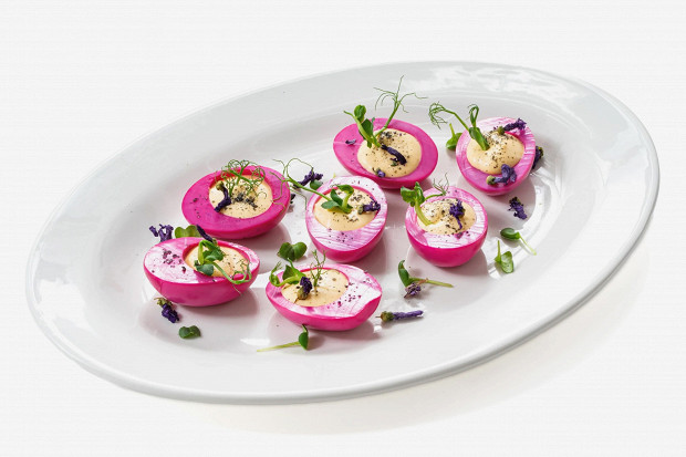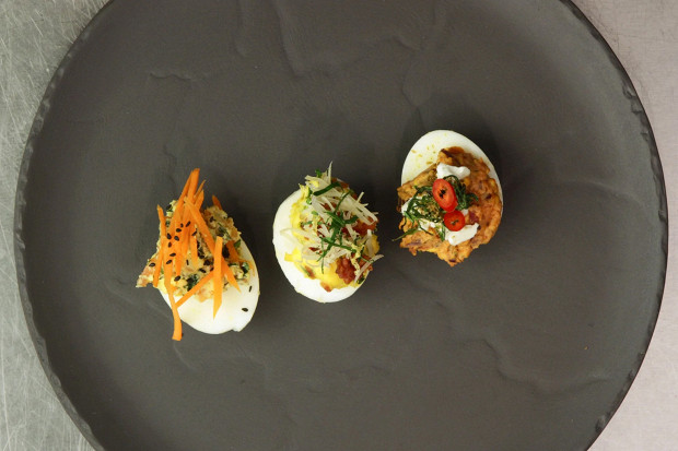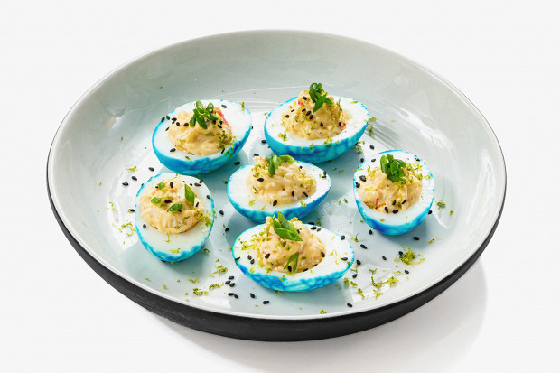 Идеальная водочная закуска — внутри яйца оказывается микс из томатной пасты, корнишонов, шрирачи, хмели-сунели и других радостей.