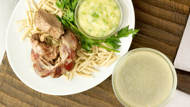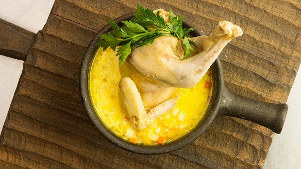 Осетинский суп, по текстуре больше похожий на рагу, — в общем, варево в самом лучшем смысле этого слова. Курица с картофелем в густом сметанно-сырном жидком соусе-бульоне — раньше это сытное блюдо готовили в глиняных горшках в печах. Осетины считают залогом успеха использование домашней курицы. В городских условиях можно купить и обычную, главное — варить ее вместе с костями. Из готового супа курицу вынимают, разделывают и подают отдельно.