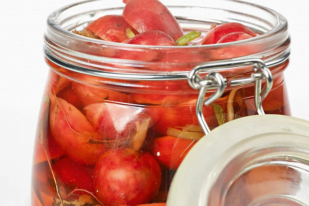Отличный способ сохранить редиску надолго, чтобы иметь ее всегда под рукой. За маринад отвечают красный и белый уксус, взятые в равных пропорциях.