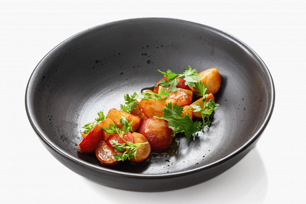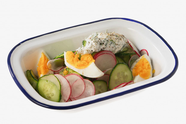 Классический салат из редьки, в котором редьку попробовали поменять на редиску. Вышло очень даже хорошо. Помимо корнеплодов, тут есть жареный лук, вареное яйцо и отварная телятина. Рецепт Сергея Сущенко, корпоративного бренд-шефа ресторанов «Чайхона №1 братьев Васильчуков».