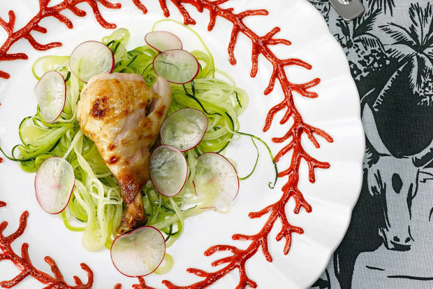 Очередное подтверждение гармоничных отношений редиски и жареных мясных блюд. Но самое примечательное в этом рецепте — готовка курицы: сначала ее варят в остывающем бульоне, а затем недолго томят в духовке.