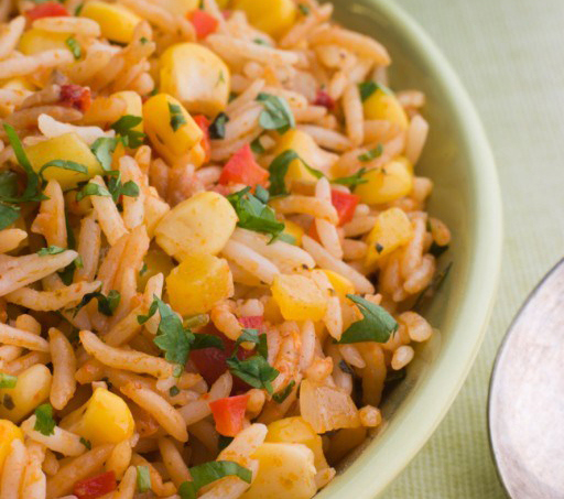 Элементарный салат, который лучше всего приготовить за пару часов до приема пищи, чтобы рис пропитался всеми соками от заправки, овощей и зелени. Отлично подойдет в качестве гарнира к рыбе или курице.