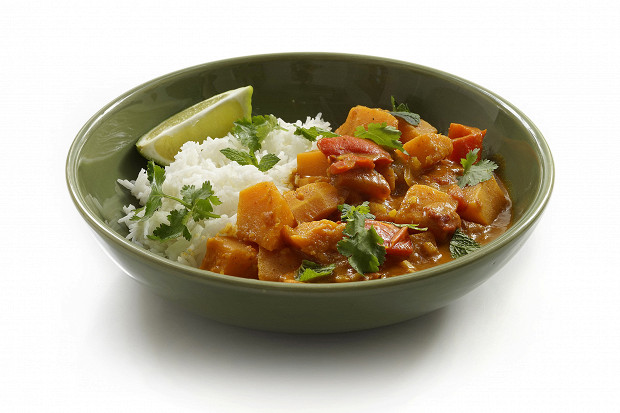 Индийская еда, простая и к тому же веганская. Мы не стали связываться с пастой карри, которая не везде продается, а использовали обычный порошок карри в пакетиках, который точно есть в каждом крупном супермаркете. Тыкву обжарили с овощами, добавили томатный соус пассата, залили кокосовым молоком и тушили до готовности. Сложив карри с рисом, мы получили самодостаточное, яркое блюдо, но если хочется, добавьте к ним в компанию, например, курицу или свинину. Лайм и зелень, упомянутые в рецепте, — важная добавка к карри, которой не стоит пренебрегать.