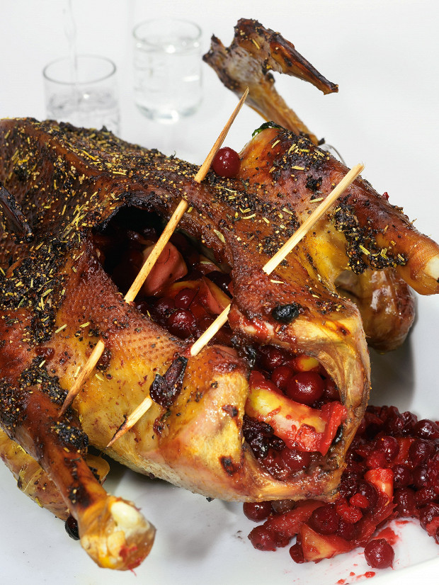 Гуся сопровождает немыслимый набор трав и специй: тимьян, чеснок, розмарин, сельдерей, корица, кинза и много чего еще. Клюква вперемешку с яблоками отправляется в утробу гуся перед запеканием.