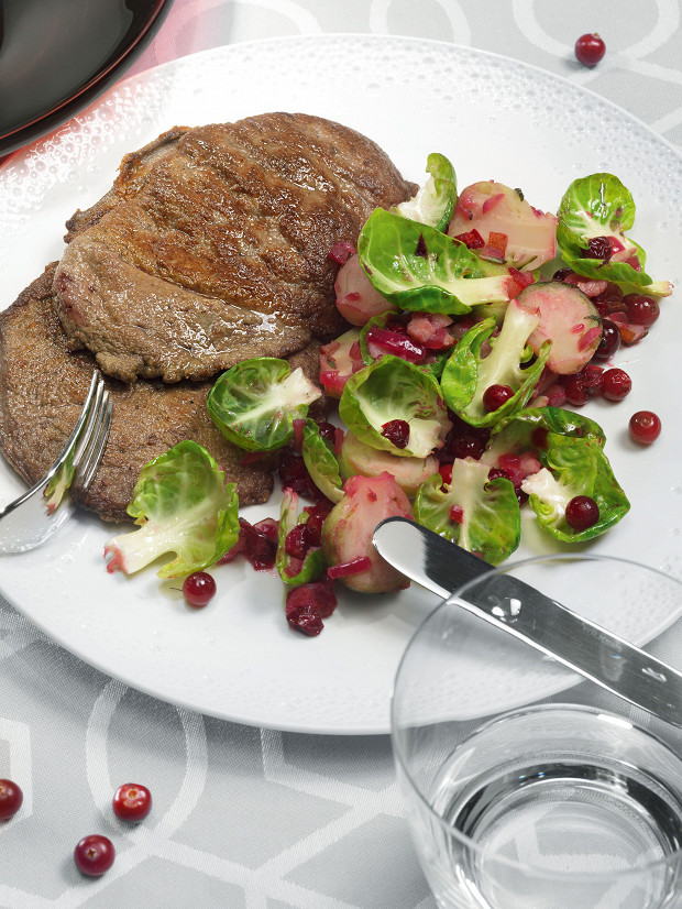К нежной телячьей печени приставлены пряный шалфей, жареный бекон, брюссельская капуста, горсть клюквы и хересный уксус. Сначала печень обжаривается, а после доводится до совершенства в духовке.