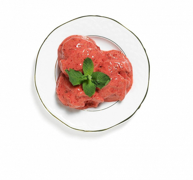 Нарядный десерт, в котором взбитые банан, клюква и клубника превратились в нежную розовую субстанцию.