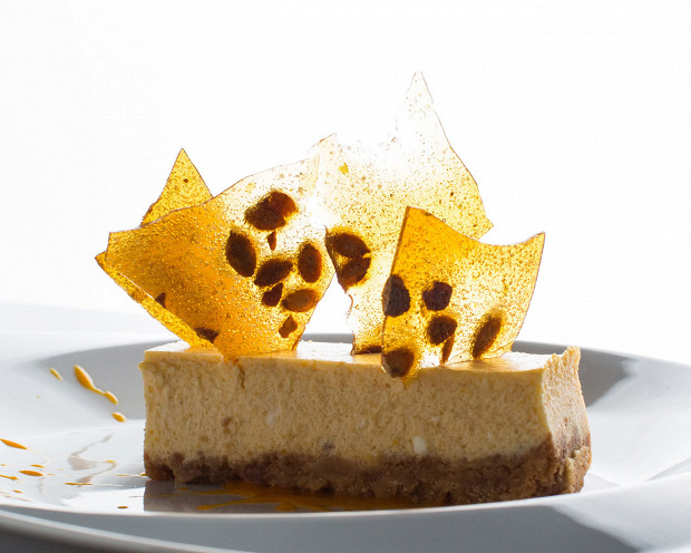 Такой чизкейк готовят в московском ресторане Disput. Предупредим сразу: пусть вас не пугает обилие ингредиентов. Часть из них идет в качестве дополнений к десерту, и от них можно смело отказаться. Облепиховое кули, которое соединяется с чизкейком уже в тарелке, правда все же лучше приготовить — ягода здорово взаимодействует с тыквой и подчеркивает ее сладость. А вот карамель с семечками — скорее элемент декора, который можно оставить за бортом. Тыквенный чизкейк так и останется тыквенным чизкейком без всяких дополнительных топингов.