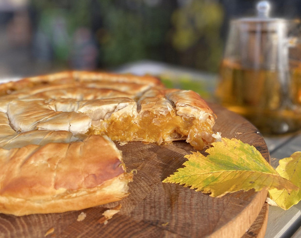 Многие традиционные греческие пироги выпекают в форме улитки — так, например, поступают со спанакопитой (подробнее можно посмотреть тут). Сладкие пироги готовят по той же схеме. Этот рецепт мы взяли в компании «Мой большой греческий пирог», которая специализируется на всевозможной греческой выпечке. Прежде чем начать готовить тыквенный пирог, он же гликья колокитопита, обзаведитесь слоеным тестом фило. Обычное слоеное тесто слегка затмит вкус тыквы, и из него не получится свернуть красивую традиционную улитку, а вот фило, больше напоминающее ткань, справится с этой задачей на пятерку.