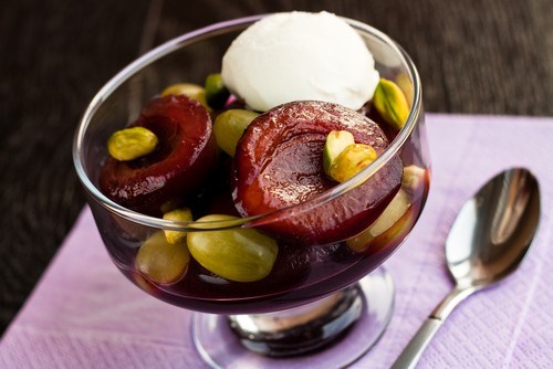 Сливы сначала надо подержать в смеси сахара и лимонного сока, а затем отправить их в духовку на полчаса. Можно есть просто так, можно добавлять к мороженому или к говядине.