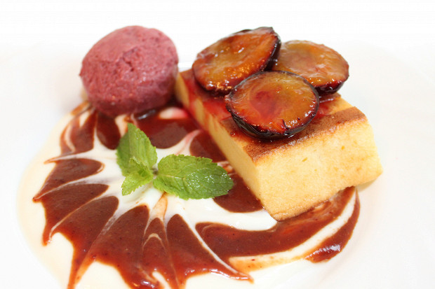 Все довольно просто: запеканка готовится отдельно, и сливами она украшается в последний момент, уже оказавшись на тарелке. Можно подавать с мороженым или мятой.