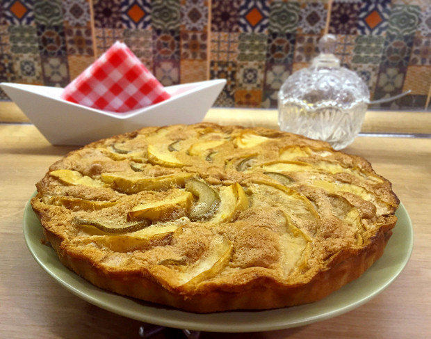 Ароматная шарлотка, которая усилена кальвадосом, грецкими орехами и сухофруктами — любыми.