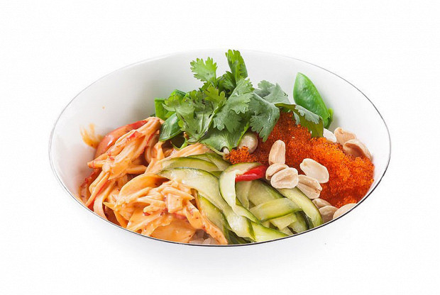 Поке с крабом, яйцом пашот и битыми огурцами