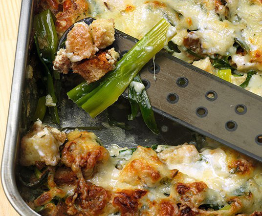 Черемшу и зеленый лук тушат до состояния нежности, а затем соединяют с румяными хлебными сухарями и заливают яично-молочной смесью.