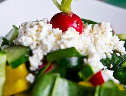 Черемша замечательно сочетается с молодой редиской: у обеих есть легкая весенняя жгучесть. Зернистый творог, прописанный в этом рецепте, должен быть сухим: в салате и так есть заправка из масла.