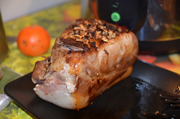 Свиной карбонад надо сначала замариновать в чесноке и оливковом масле, затем обжарить на сковородке, и уже потом отправить его в мультиварку часа на три.