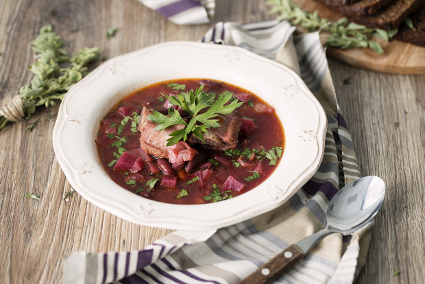 Этот борщ не требует свекольной зажарки и поэтапного закладывания ингредиентов в кастрюлю. Все кладется сразу и варится полтора часа.