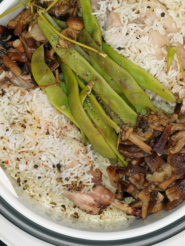 Кролик с опятами, рисом басмати и стручковой фасолью