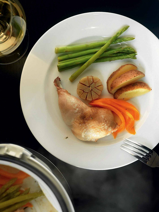 Курица с томленым чесноком, картофелем, зеленой спаржей и перцем