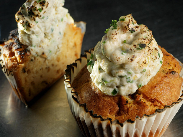 Способ красиво упаковать с собой крабовый салат. До места назначения готовые сырные кексы и крем из крабов поедут в отдельных контейнерах, а после вы жестом фокусника быстро сотворите из них нарядные капкейки: если есть кондитерский мешок — используйте его, нет — тогда крем можно нанести ложкой.
