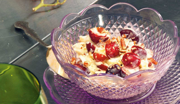 В оригинале требуются не грецкие орехи, а орехи пекан. Но разница небольшая. Пекан — чуточку поблагороднее, но этого благородства все равно не видно за сметаной и майонезом.