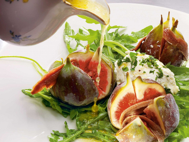 Инжир с анчоусами, творожным сыром, медовым соусом и рукколой