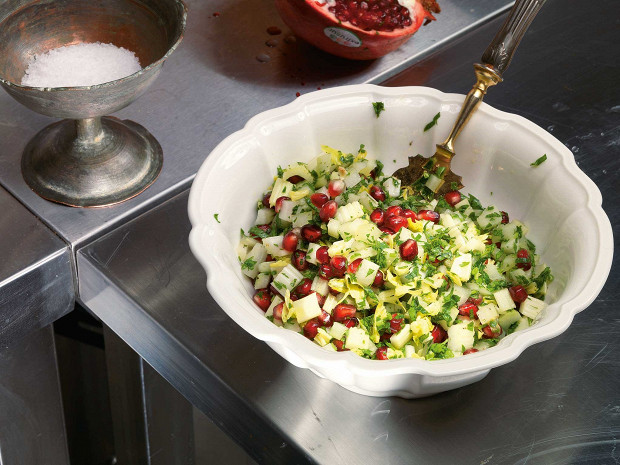 Компоненты нарезают мелко, кусочки сельдерея по размеру должны быть сопоставимы с зернами граната.
