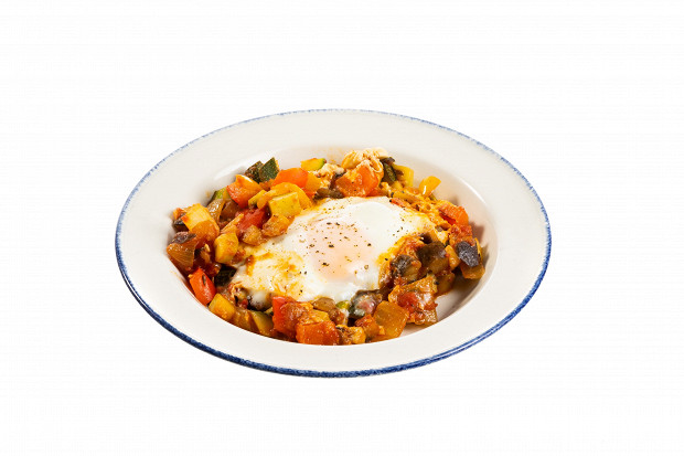 Испанское овощное рагу: горячие тушеные овощи нужно залить яйцом, да так, чтобы не повредить желток.