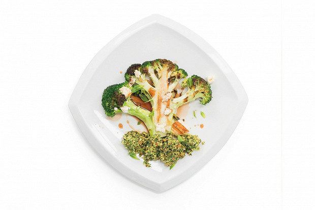Печенная на гриле брокколи в окружении двух ярких и очень разных соусов — песто с миндалем и наршараб с лаймом и рыбным соусом.