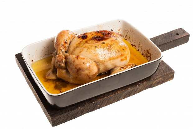 Для того, чтобы запеченная курица стала идеальной, понадобится время — и ей, и вам. Конкретно в этом случае — не меньше восьми часов: ночь уйдет на то, чтобы курица пропиталась рассолом, и еще час закладывайте на запекание. Кожица станет хрустящей, если поливать курицу выделяющим из нее соком, а в конце обмазать смесью из меда и масла.