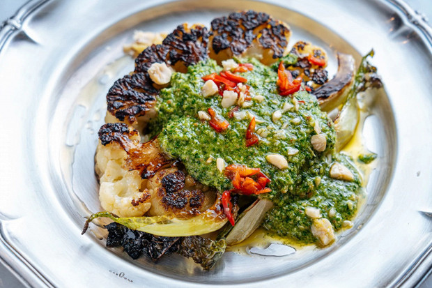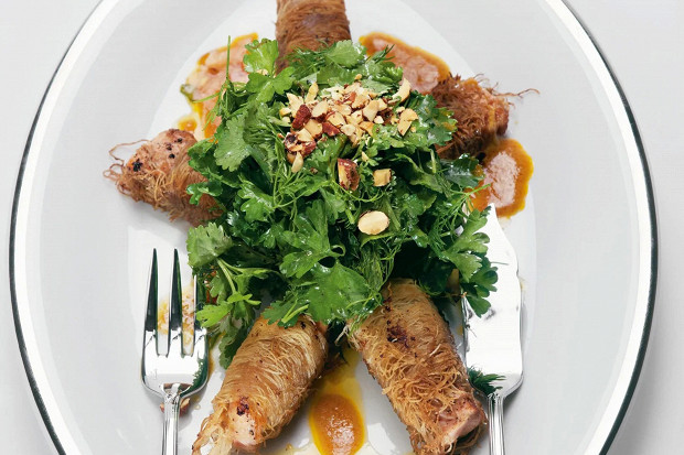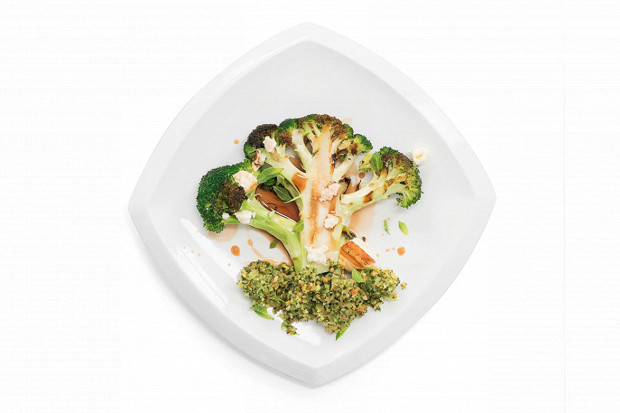 Показательный пример того, как удачно вписывается брокколи в различные азиатские истории. Это пышное блюдо построено на балансе двух соусов: в первом (состоящем из наршараба, мяты, кинзы, сока лайма и лимона, уксуса и рыбного соуса) капуста обжаривается, а со вторым (куда входят миндаль, лимон, мята, оливковое масло и кленовый сироп) подается.