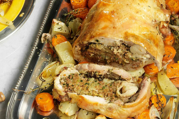 Индейка здорово сочетается с бараниной — смягчает ее крепкий дух и умиротворяет ее жирность. Всегда бы им выступать в таком союзе. Мясные горячие блюда на Новый год немыслимы без рулетов: это красиво, практично и очень эффектно!