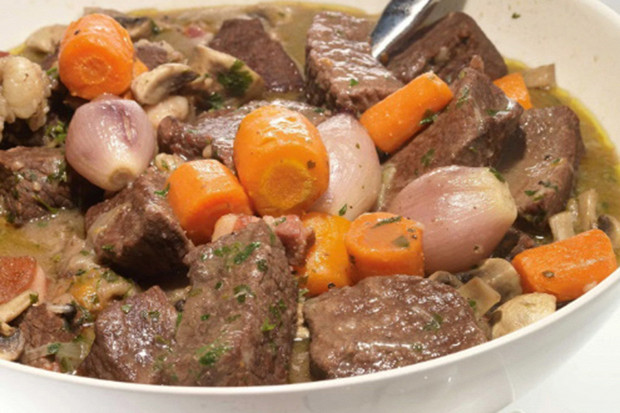 Bœuf bourguignon (беф-бургиньон), говядина по-бургундски, — классика французской кухни, традиционный способ сделать жесткое мясо прекрасным с помощью красного вина. Во вкусовом ансамбле также участвуют лук, морковь, чеснок, иногда грибы. Готовится блюдо долго — не менее трех часов — но в течение этого времени почти не требует к себе внимания. Новый интерес к этому рецепту вспыхнул после выхода фильма «Джули и Джулия» — Джулия Чайлд называла его едва ли не главным рецептом французской кухни вообще. Мы добавили в это блюдо еще и бекон для разнообразия.