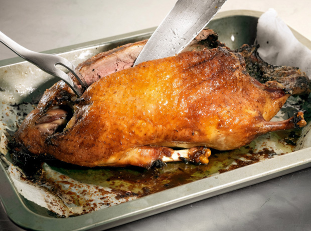 Простой и нежно любимый нами рецепт, в котором гусь сначала маринуется в апельсиновом соке с восточными пряностями, а потом запекается в духовке. Обратите внимание на фольгу — она придаст гусю сочности.
