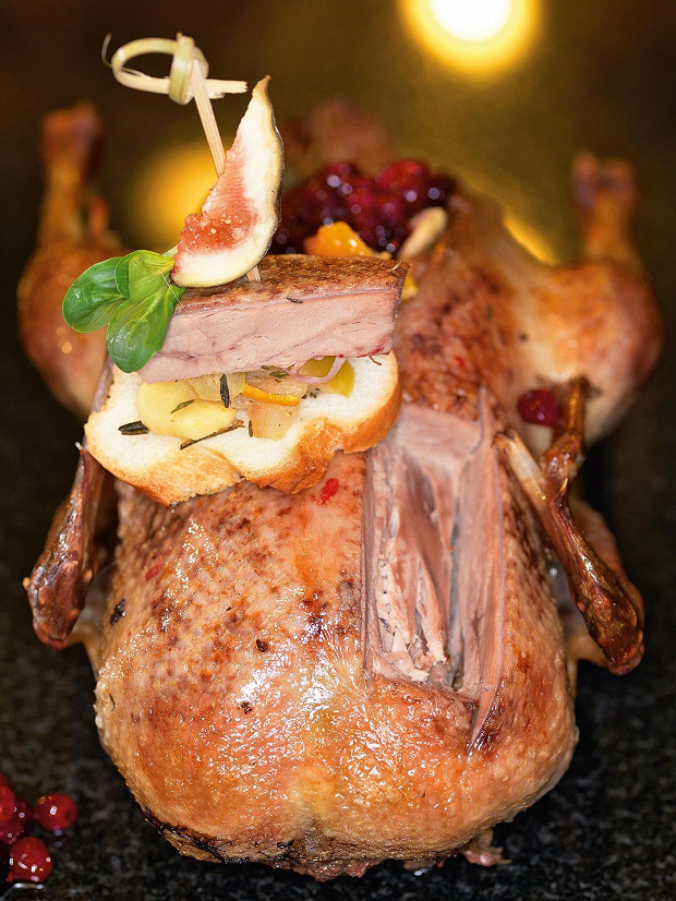 С пряностью тут и правда полный порядок: мандарины, яблоки, инжир и клюква встречаются с имбирем, шалфеем, мятой, розмарином, тимьяном и корицей. Подавайте к этой утке какое-нибудь тихое вино и не соединяйте ее с глинтвейном, а то будет перебор.