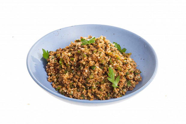 Булгур хорош и сам по себе, с оливковым или сливочным маслом. Но тут к нему добавилась масса разнообразных ингредиентов, которые нисколько его не затмевают, а только делают интересней: два вида лука, три вида перца, наршараб, томатная паста и много другого. Идеально сложится с бараниной и говядиной.